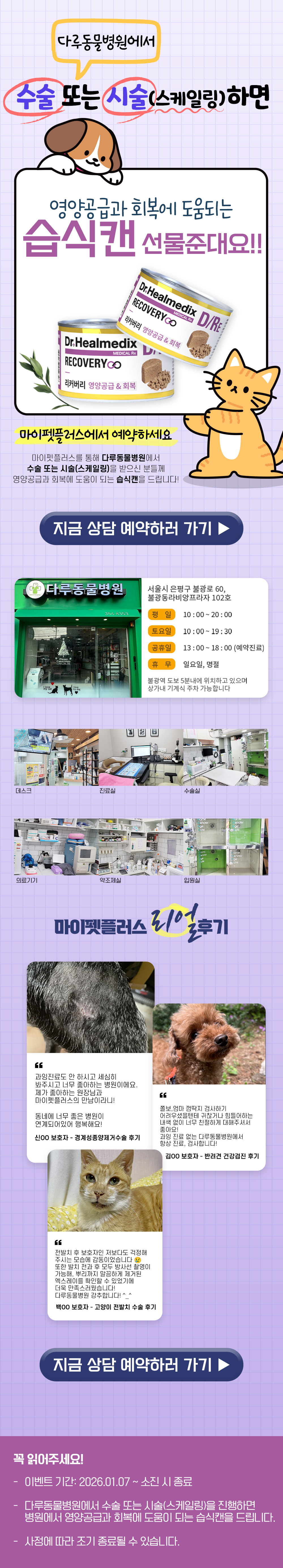 [다루동물병원] 수술 또는 시술(스케일링)하면 습식캔 선물드려요!
