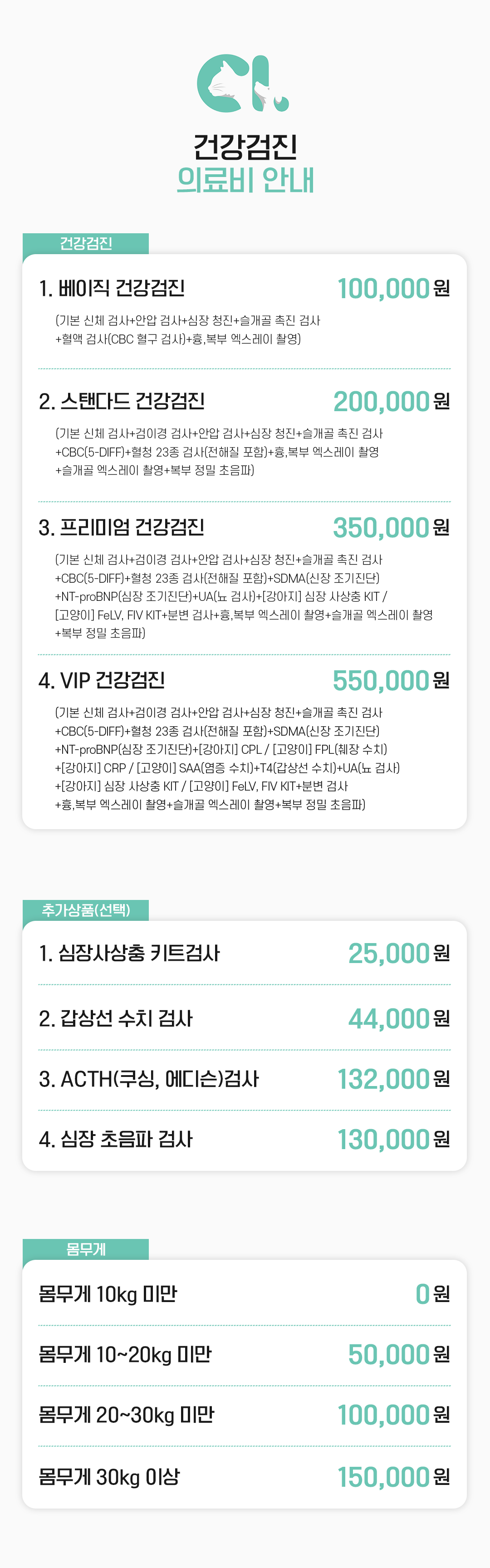 단계별 건강검진, 혈액검사, 방사선촬영, 정밀 초음파, 슬개골촬영, 심장 초음파